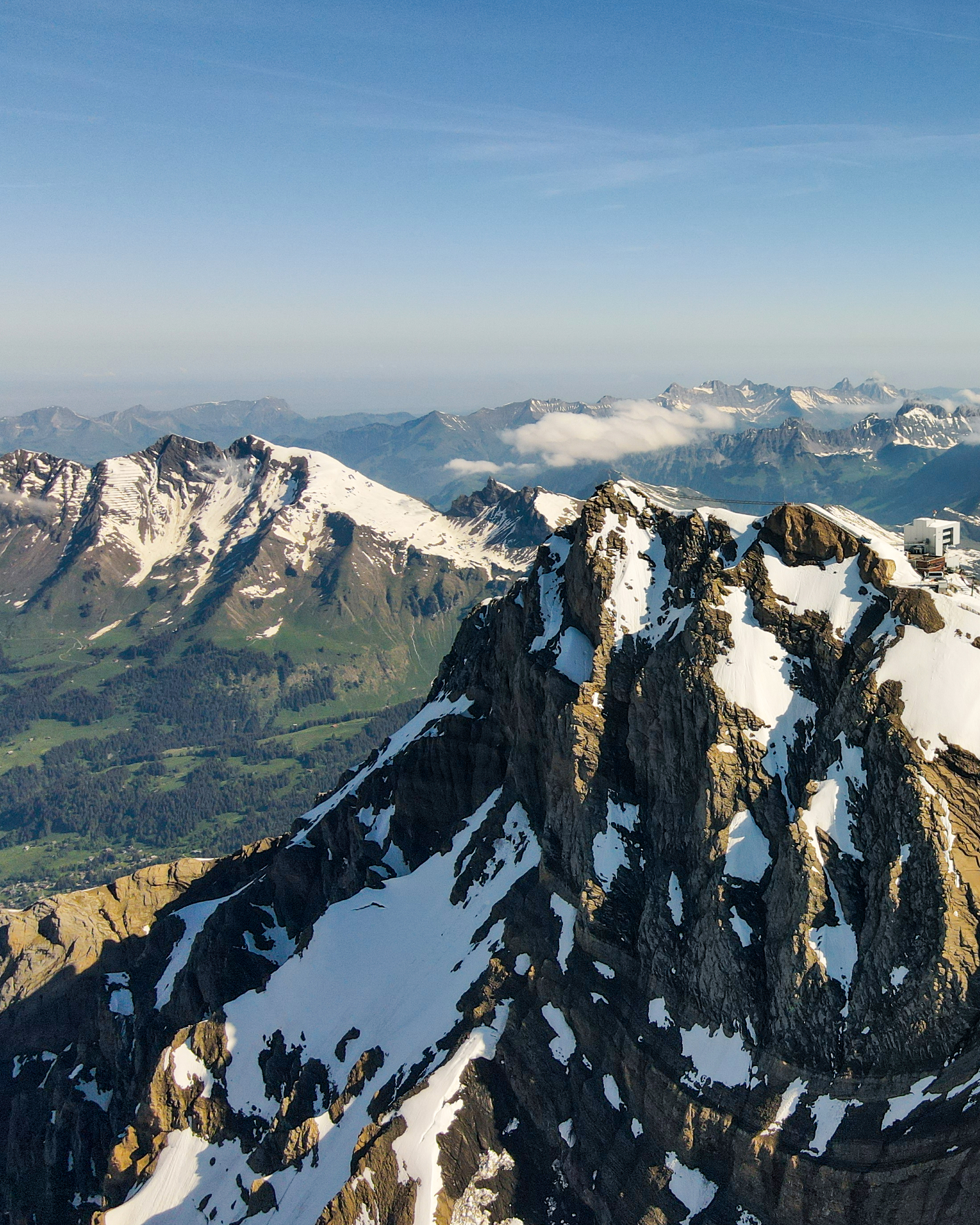 Glacier 3000 in the Lake Geneva region offers views of 24 Alpine peaks, including the Matterhorn, Eiger, Jungfrau, and even the distant Mont Blanc.