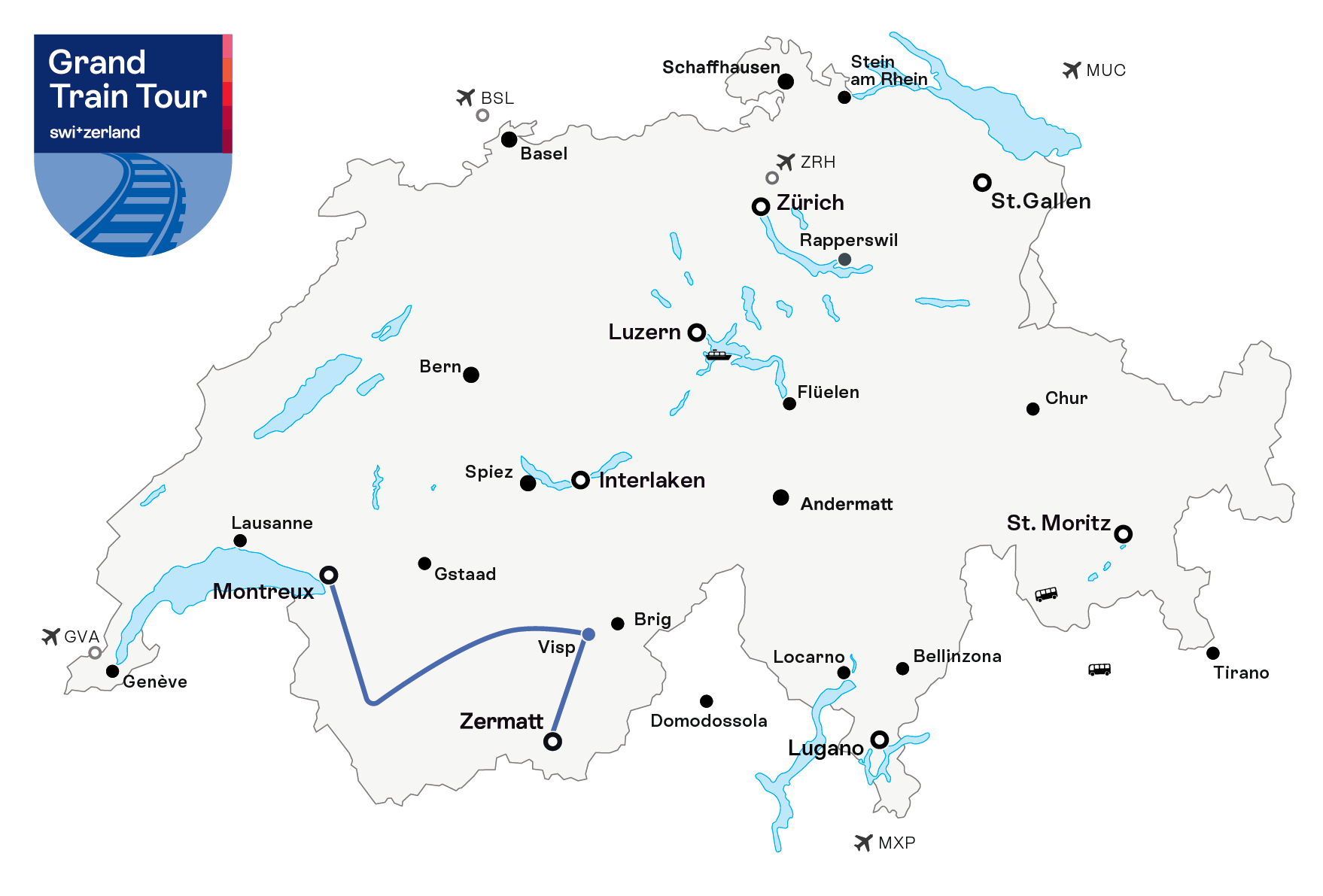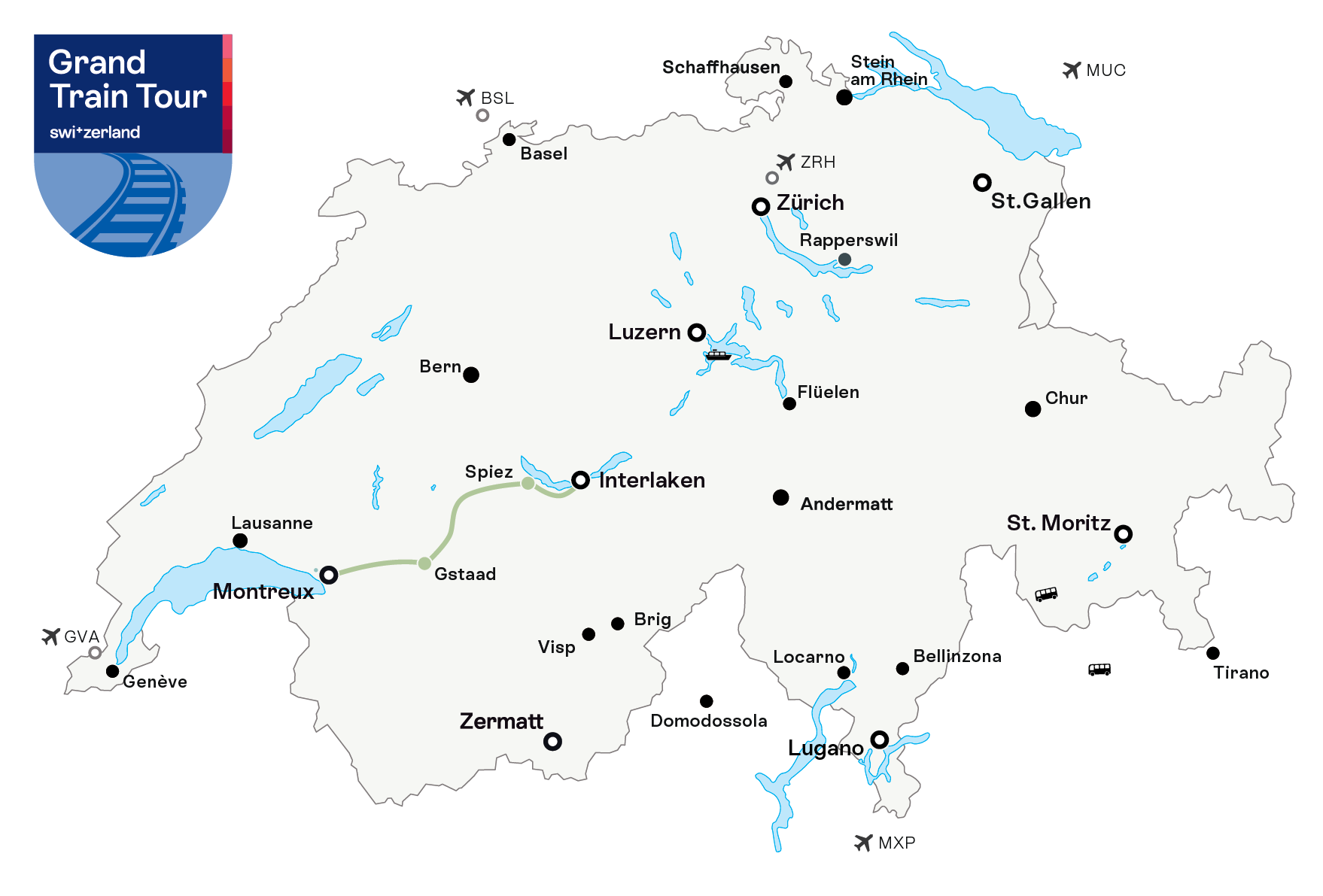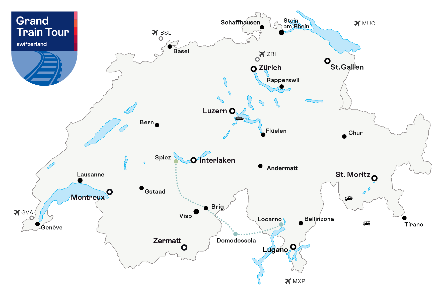 Our Travel Suggestions are curated routing ideas for the Grand Train Tour of Switzerland and a platform for sales, planning and inspiration. They can be booked via Travel Trade (B2B) or International Customer (B2C). Special B2B packages are available for all journeys. However, passengers can also enjoy the suggested routes individually with the Swiss Travel Pass.