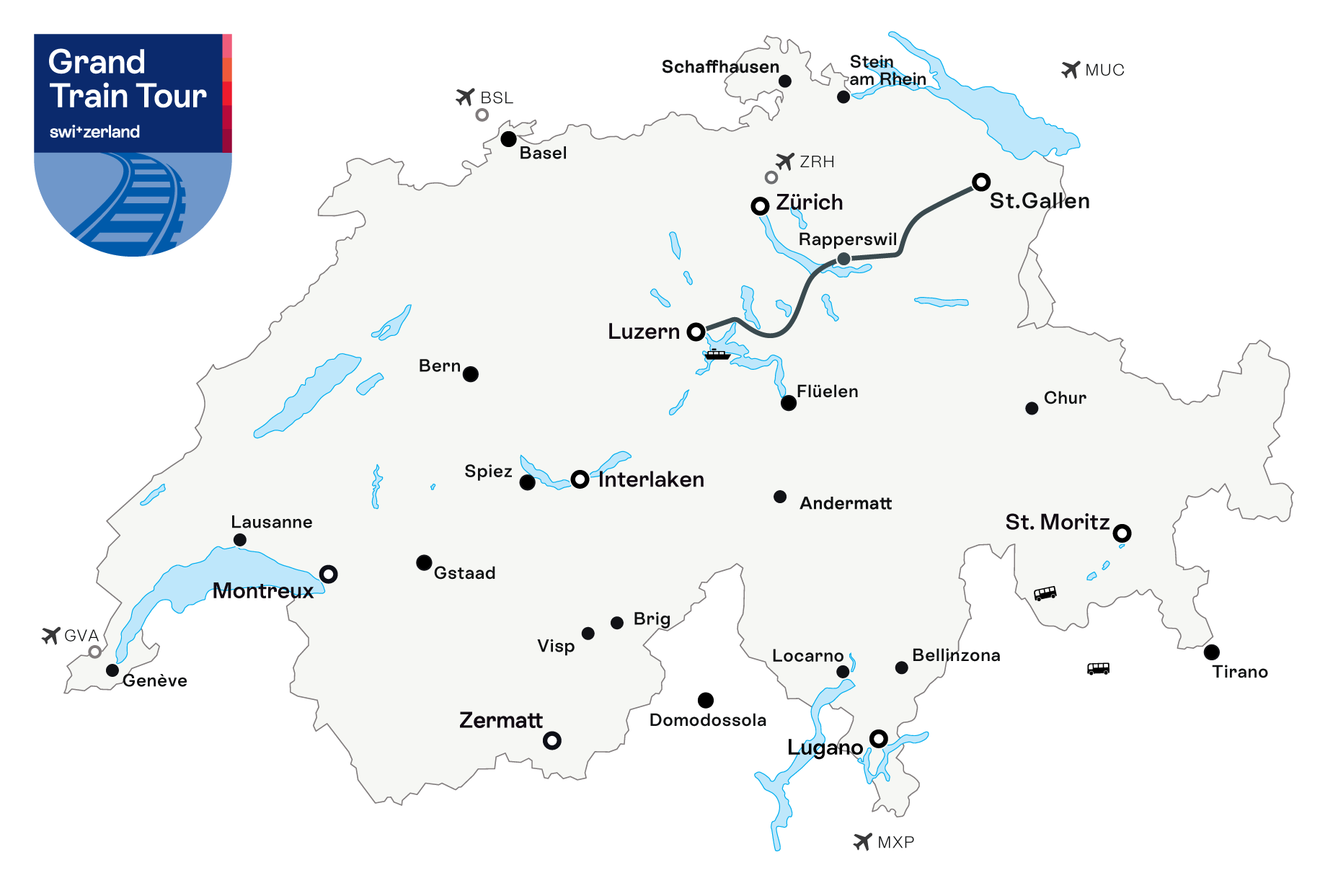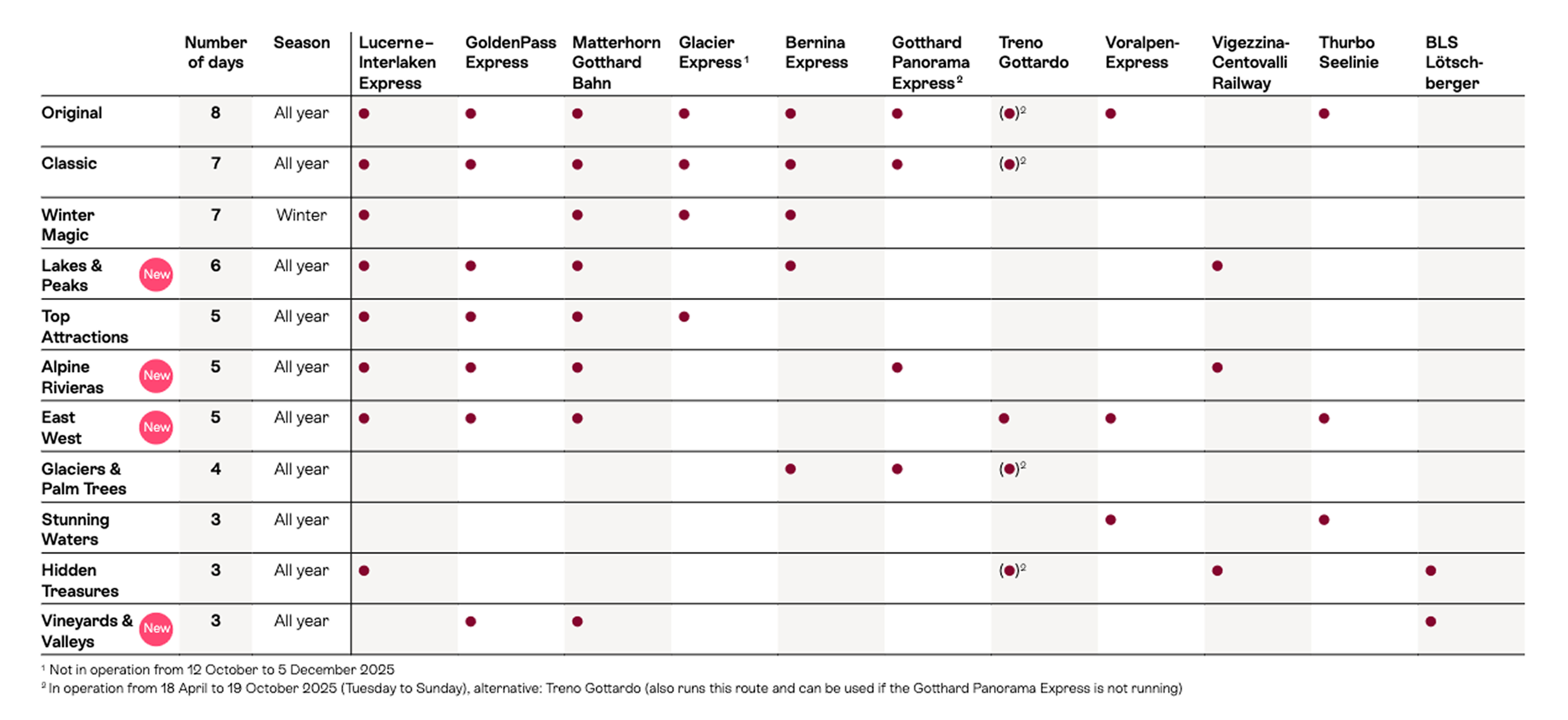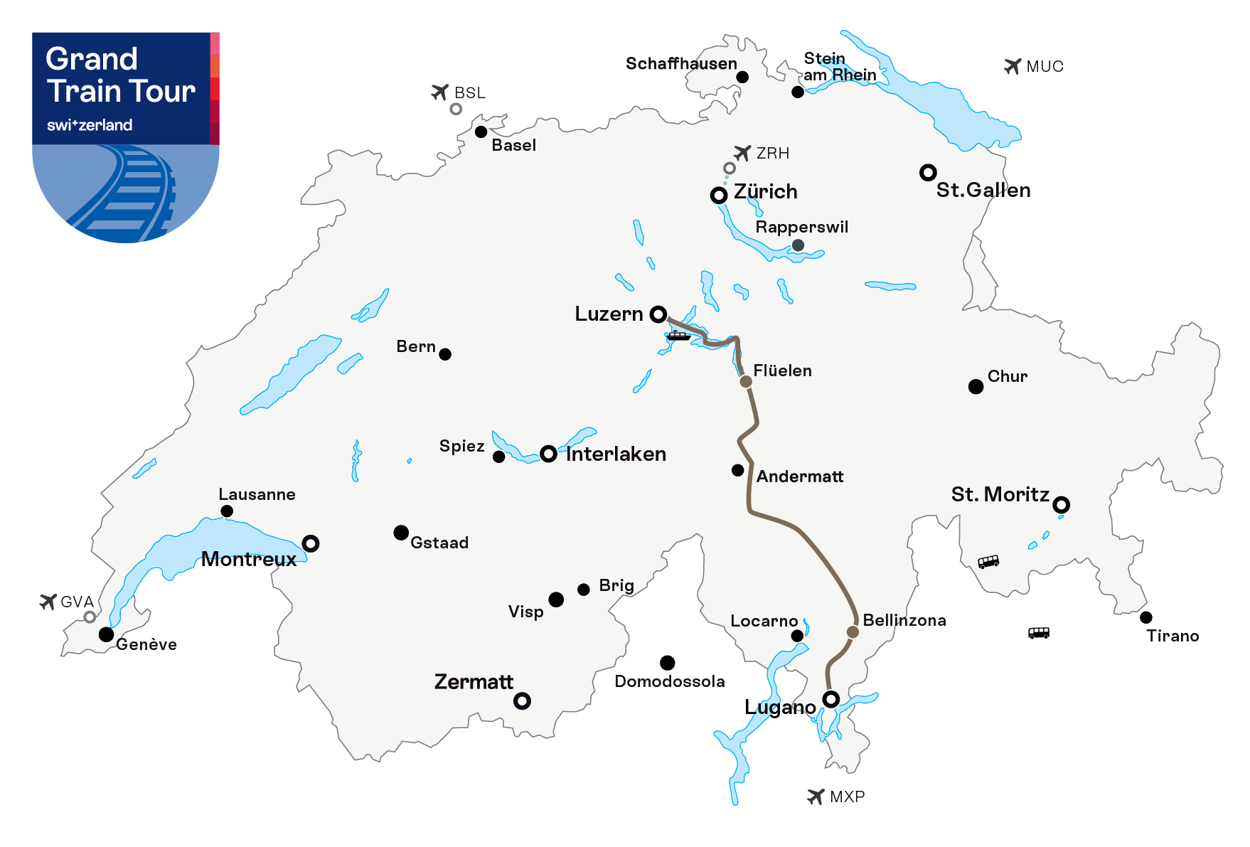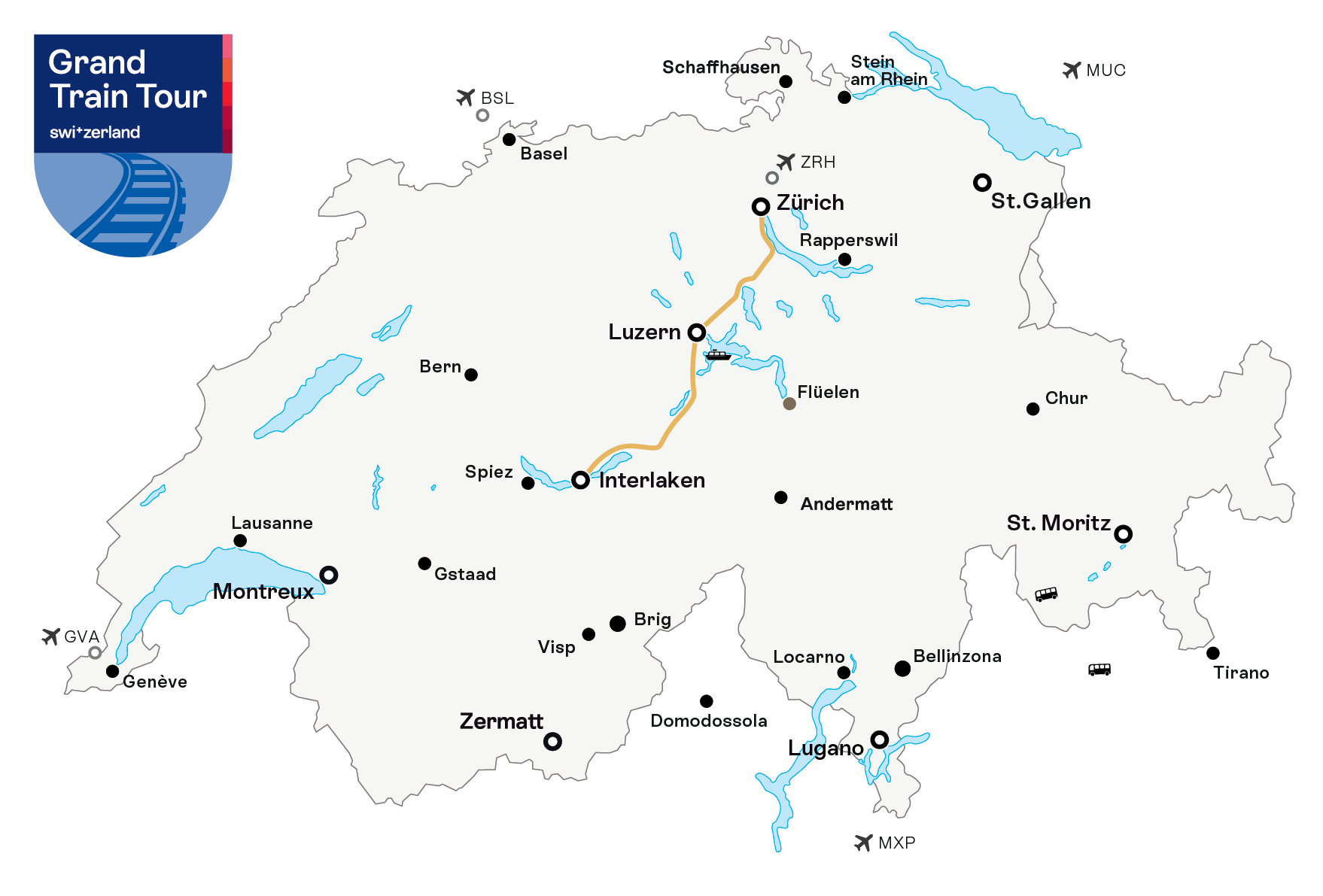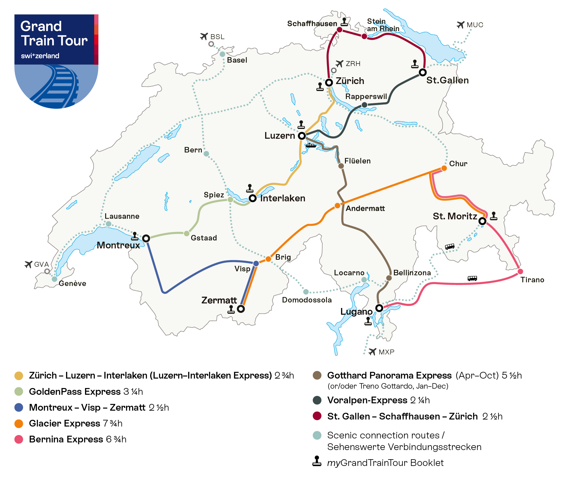 Scenic train and boat lines: Glacier Express, Gotthard Panorama Express, Luzern–Interlaken Express