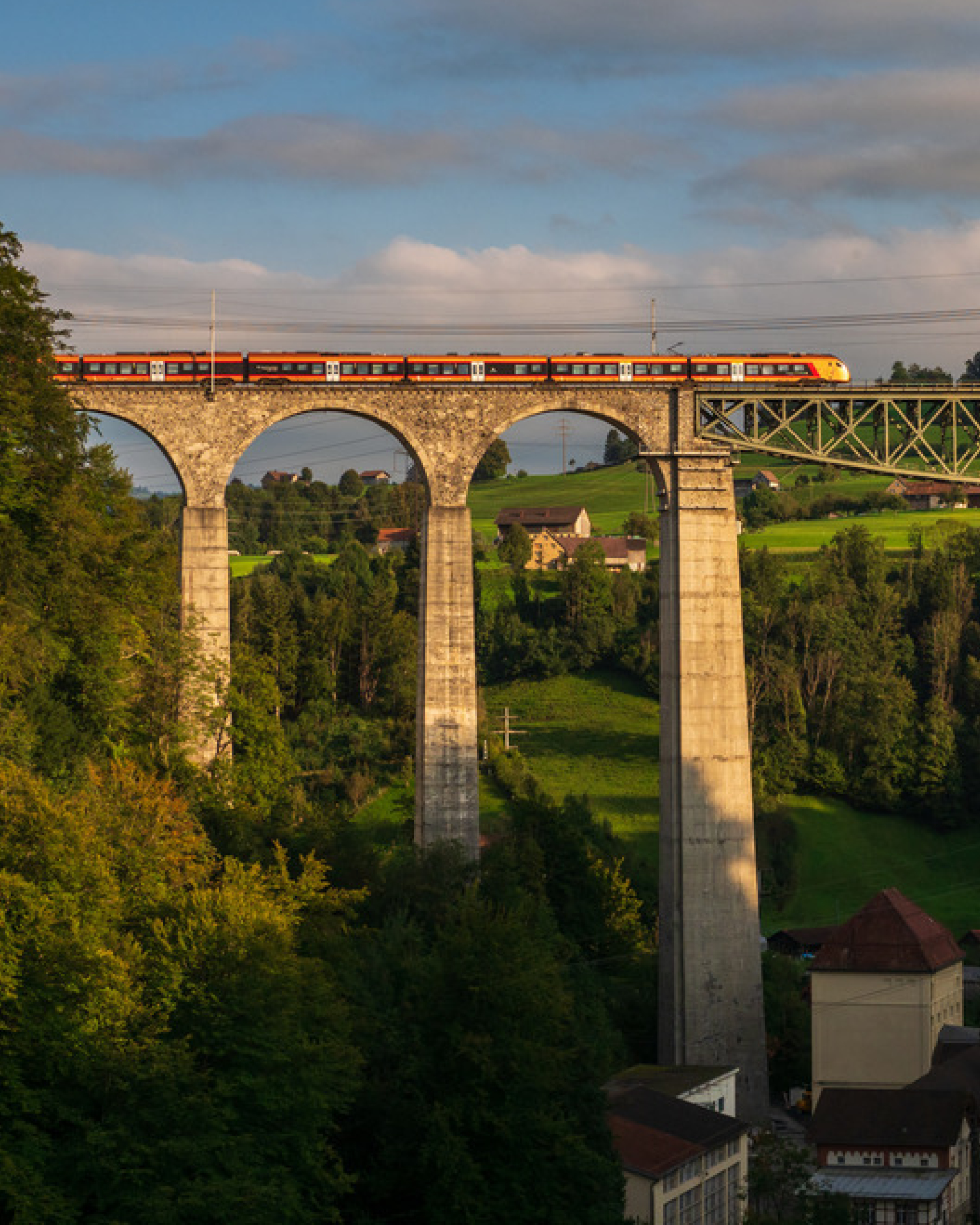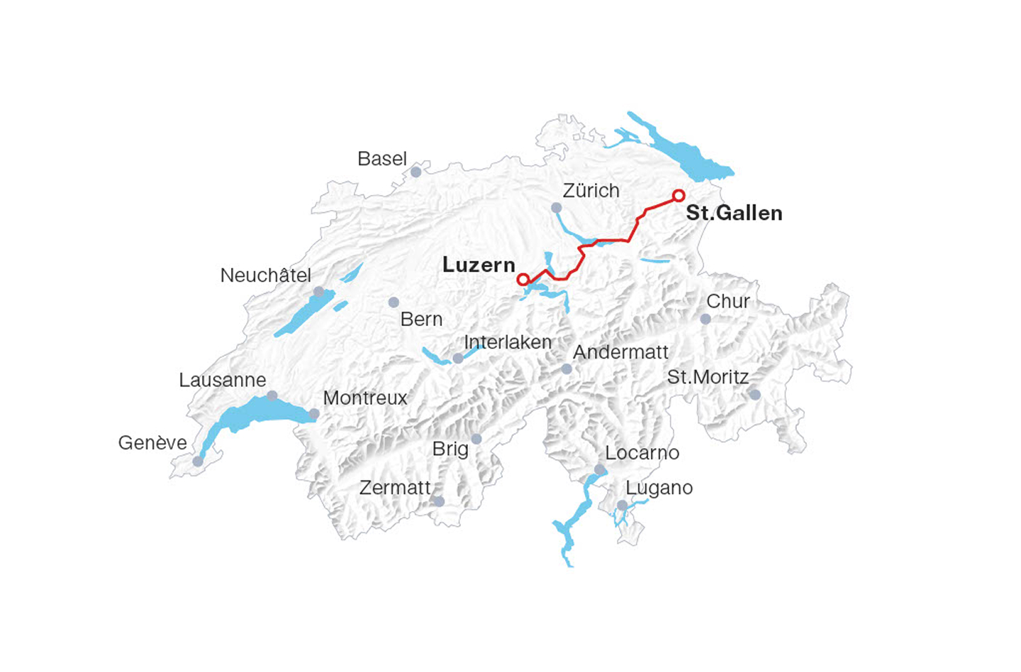 This scenic train journey connects the vibrant cities of Lucerne and St. Gallen in 2h 18 min and is part of the Grand Train Tour of Switzerland.