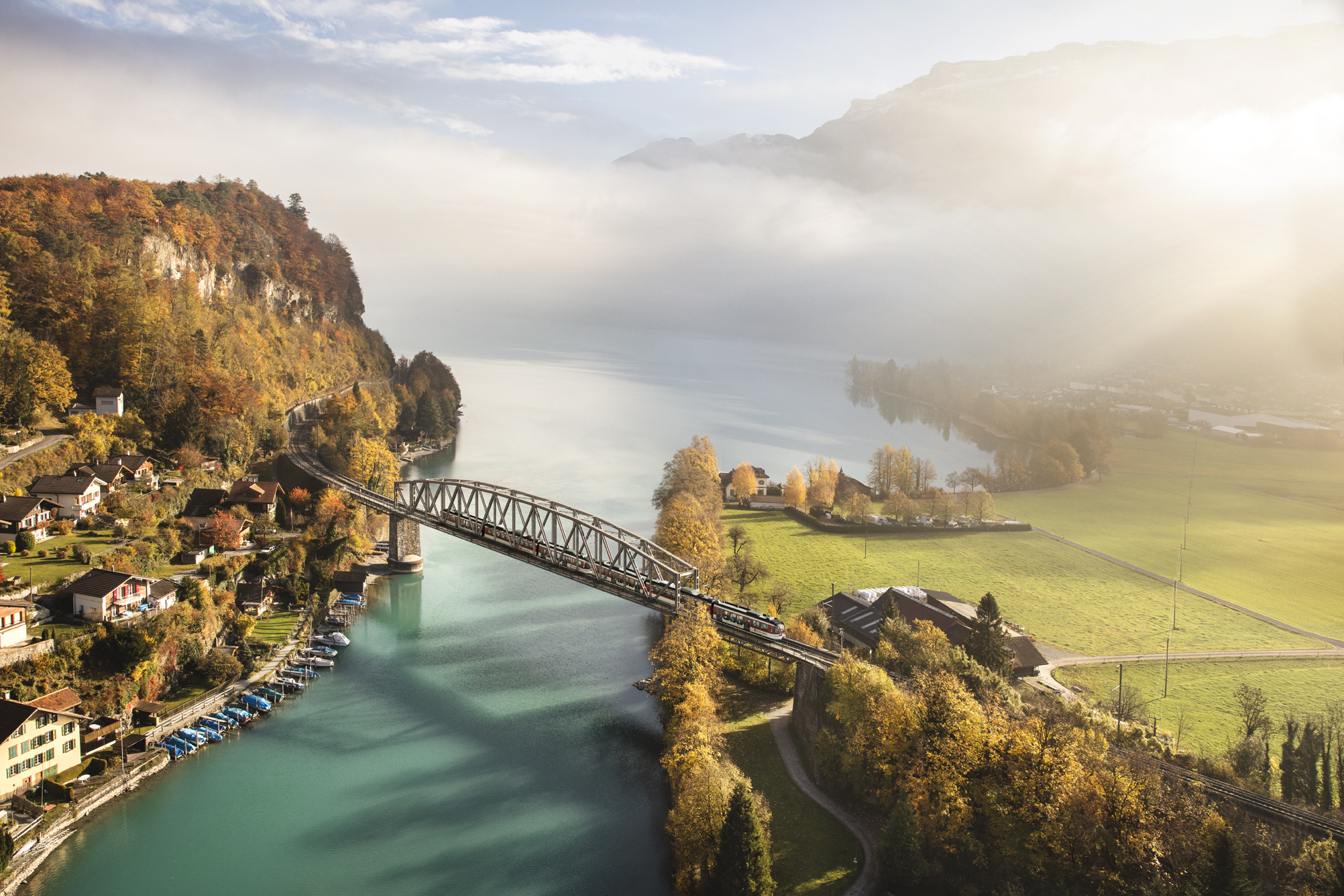 Bild: Luzern–Interlaken Express auf der Aarebrücke, Berner Oberland
