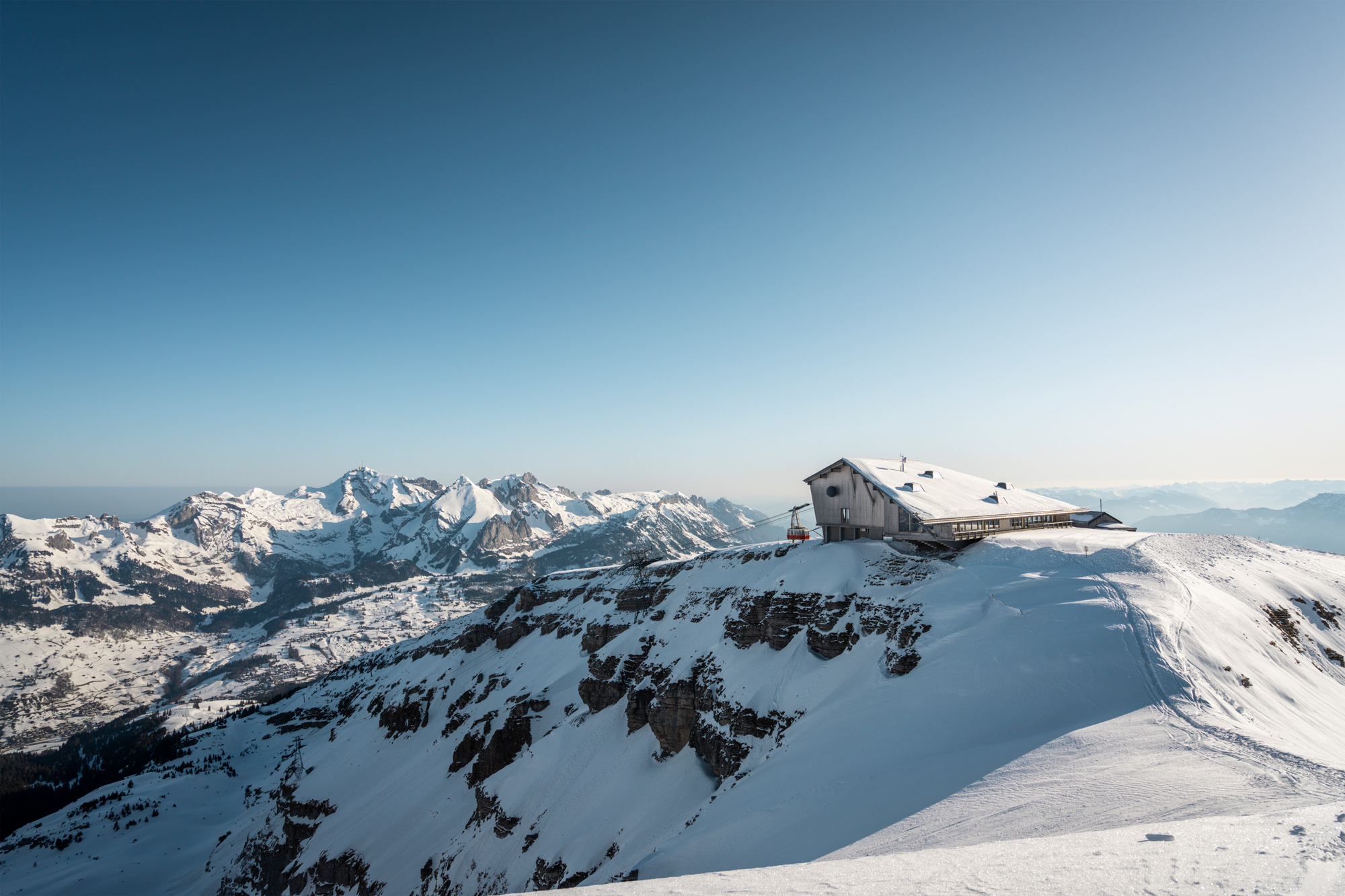 Hier oben erwartet die Gäste Weltklasse-Architektur von Herzog & de Meuron mit der Bergstation und Gipfelrestaurant und macht den Bergausflug zu einem kulturellen Erlebnis, während die Hochebene Rosenboden zur Panoramarundwanderung im Sommer und Winter einlädt.