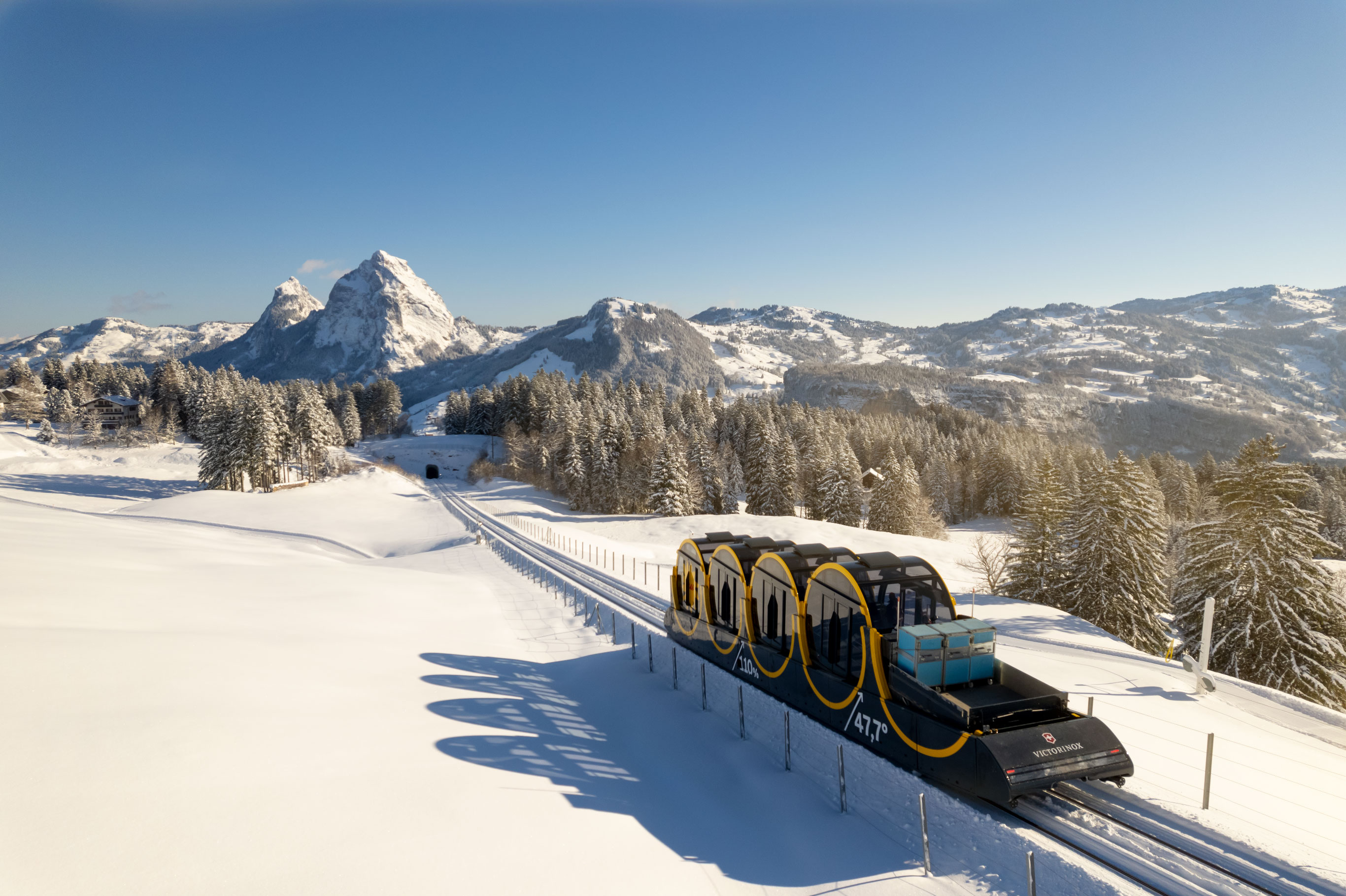 Im Herzen der Schweiz lockt eine technische Innovation mit Weltrekord: Die steilste Standseilbahn der Welt von Schwyz auf den Stoos.