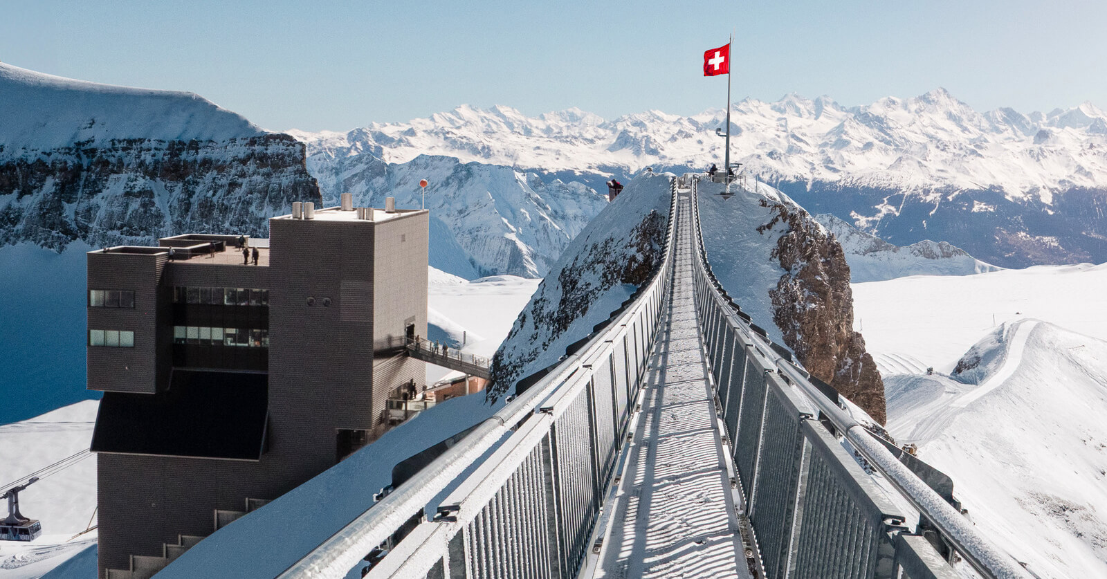 Die weltweit einzige Gipfel-zu-Gipfel-Hängebrücke, ganzjährig geöffnet, mit Sicht auf Matterhorn, Mont Blanc und Jungfrau.