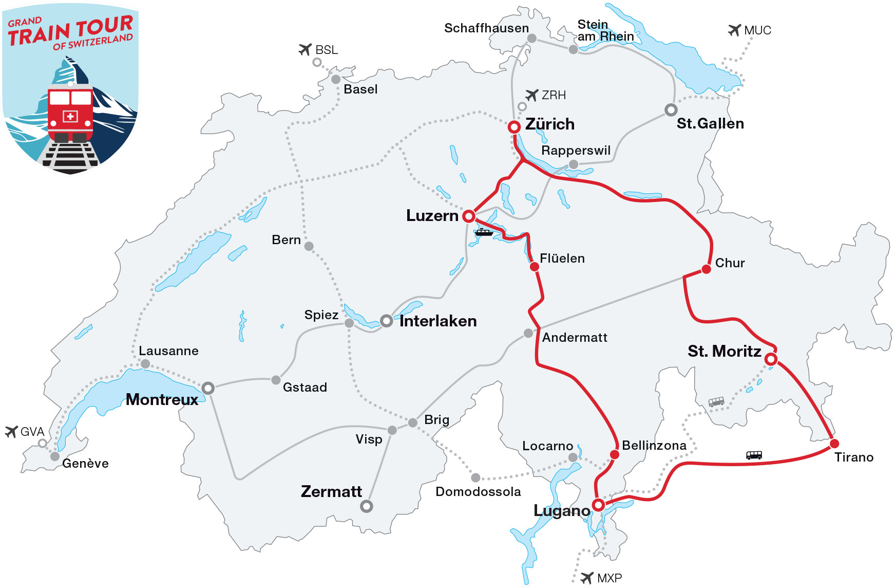 Map: Grand Train Tour of Switzerland – Glaciers & Palm Trees Tour