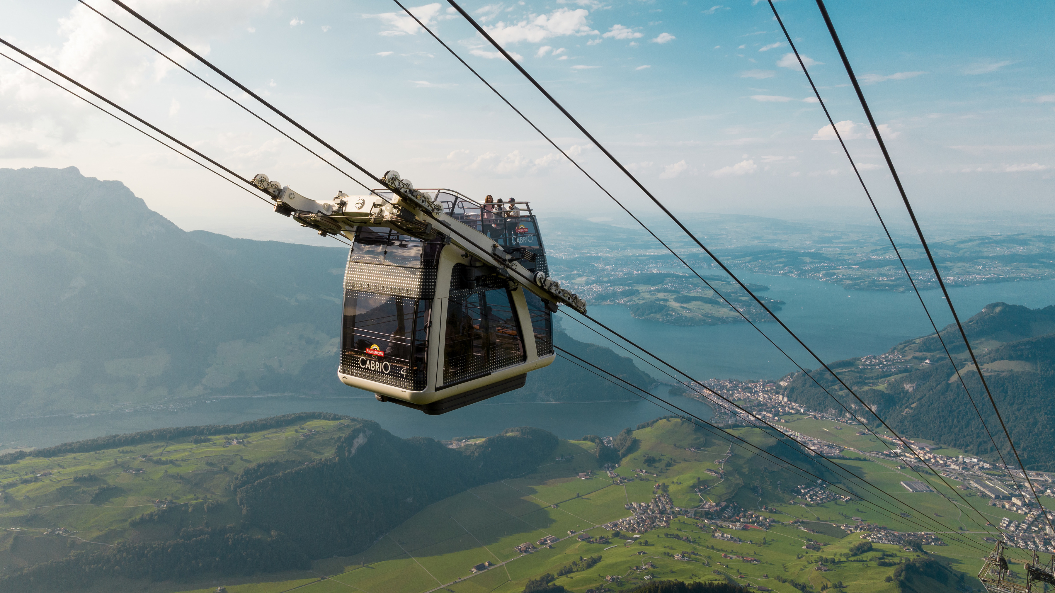 Since 1893, the open wood coaches have been calmly travelling from Stans to the Stanserhorn peak. Starting at the intermediate station, the aerial cableway with its open roof deck is one of the main attractions. It is a truly amazing feeling to stand up there on the roof of the double-deck panorama cabin and experience up close the passage between the supporting masts, just enjoying the headwind and the magnificent view – without any cables overhead.