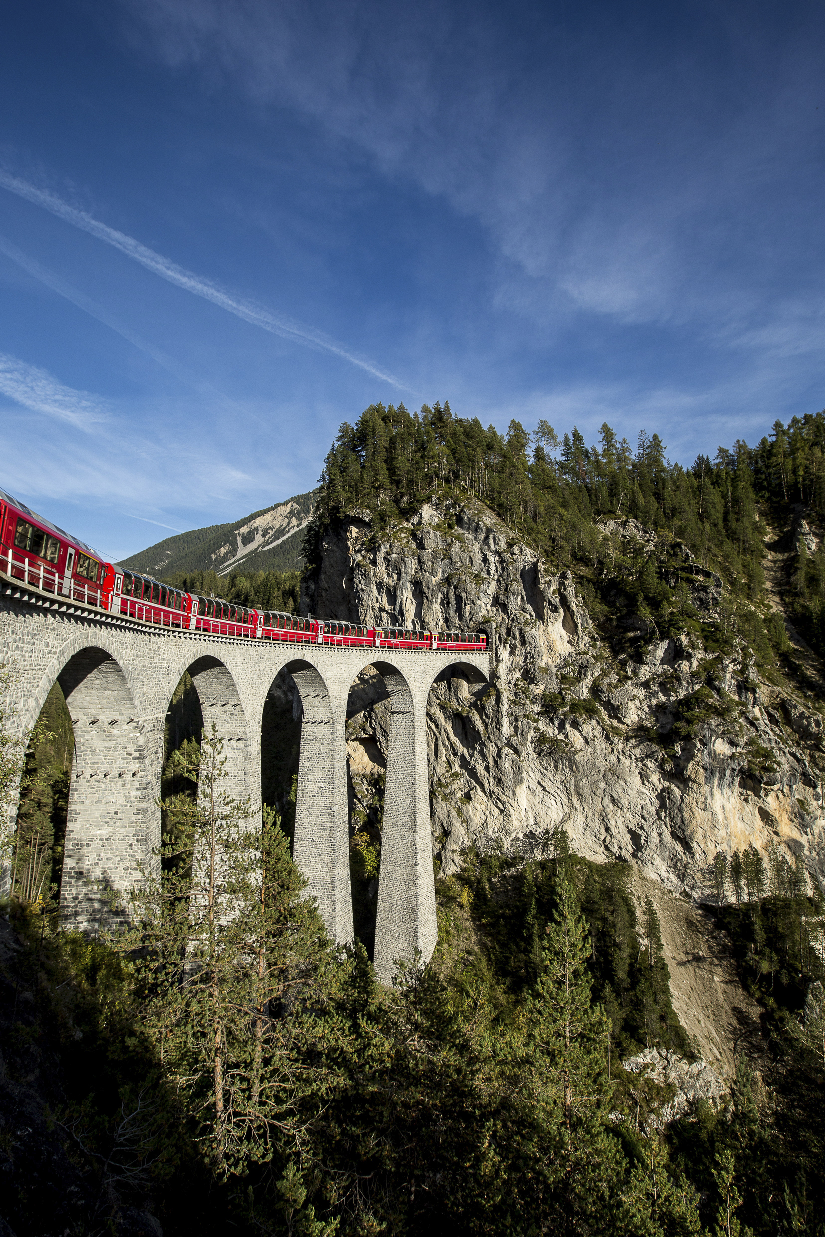 Crossing the Alps in the Bernina Express certainly is one of the most spectacular ways to do it. Along the way, the Bernina Express rolls Hollywood-style over the 65-metre-high Landwasser Viaduct, the signature structure of the Rhaetian Railway and the UNESCO World Heritage site.
