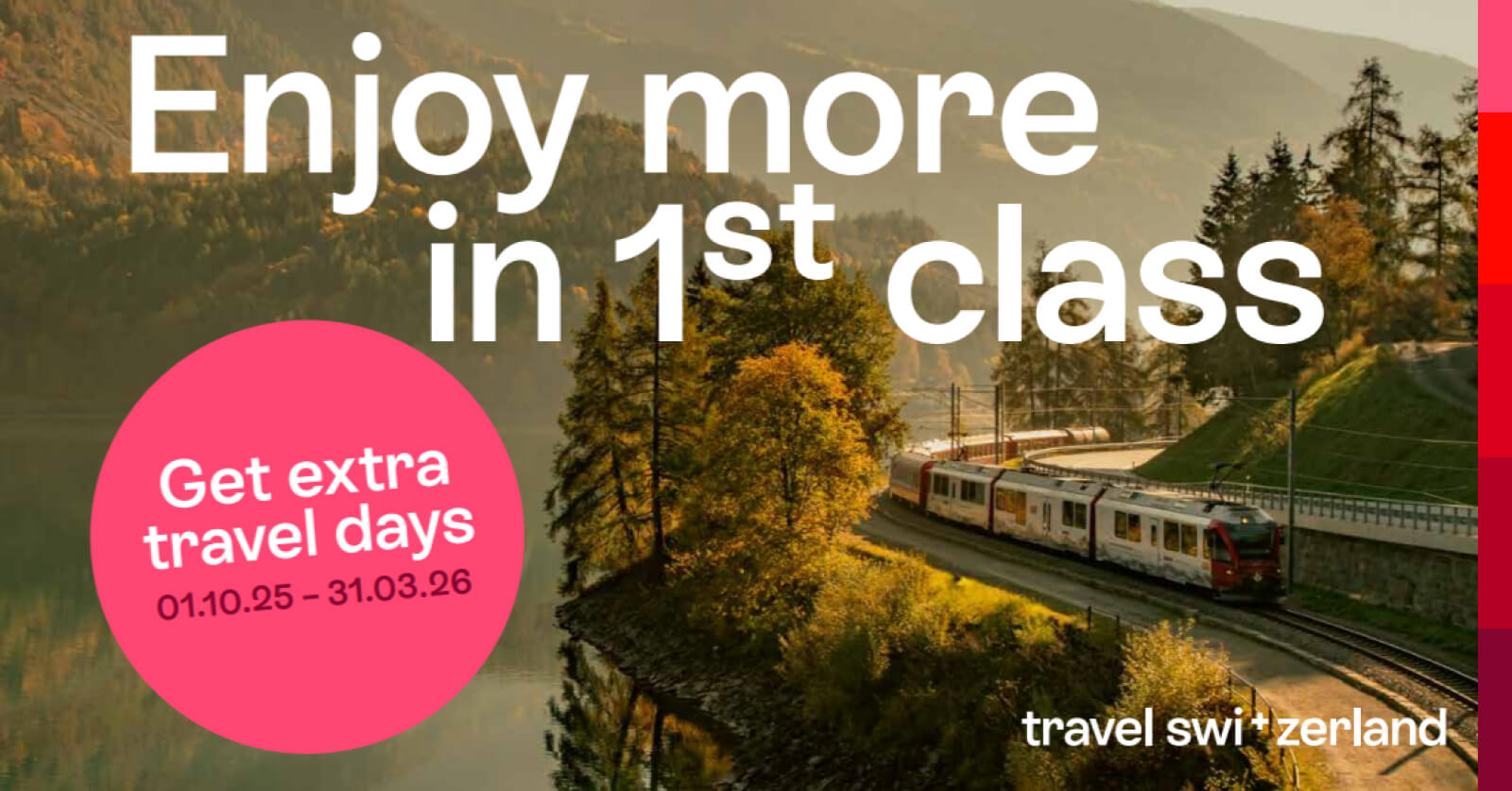 At the end of November, our global 1st Class Swiss Travel Pass Promotion came to a successful close – delivering results that significantly exceeded our internal expectations. Thanks to the strong support of our international distribution partners, global visibility for the Swiss Travel Pass was further increased. The promotion also confirms the growing interest in travelling comfortably in 1st class, as well as in the shoulder seasons in Switzerland.