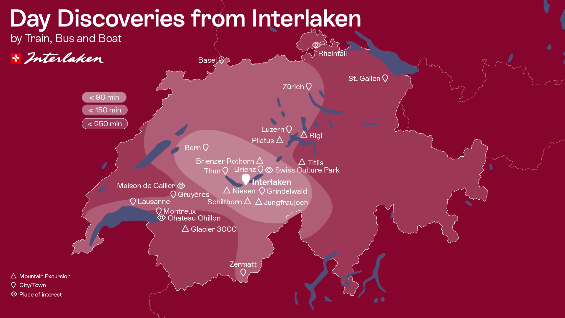 Interlaken – the holiday home in the heart of Switzerland – is a great hub for Day Discoveries in the Bernese Oberland, but also to Switzerland’s other regions, cities and mountains.