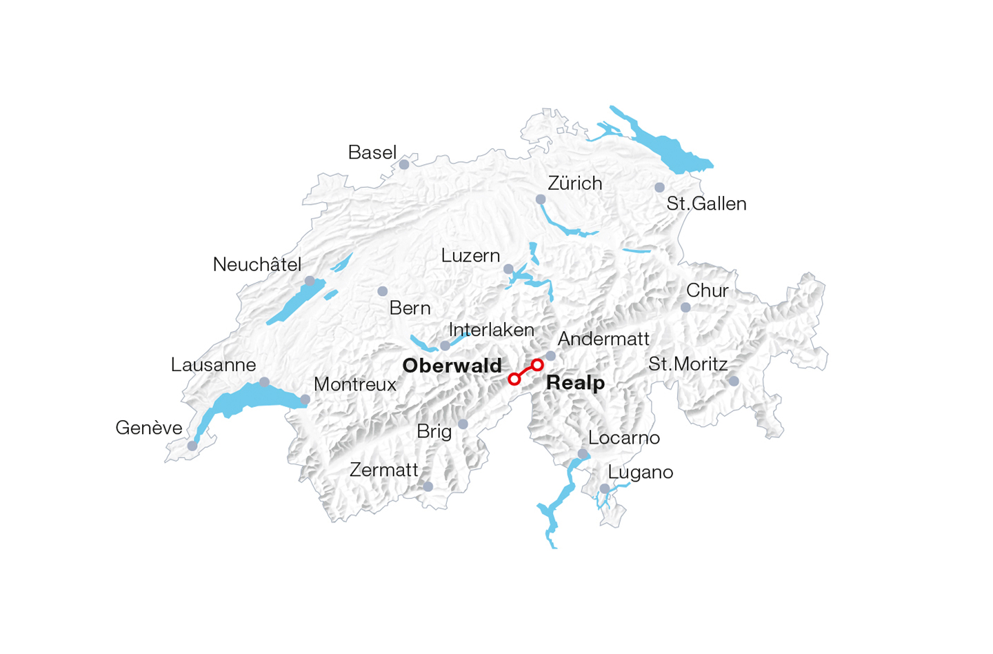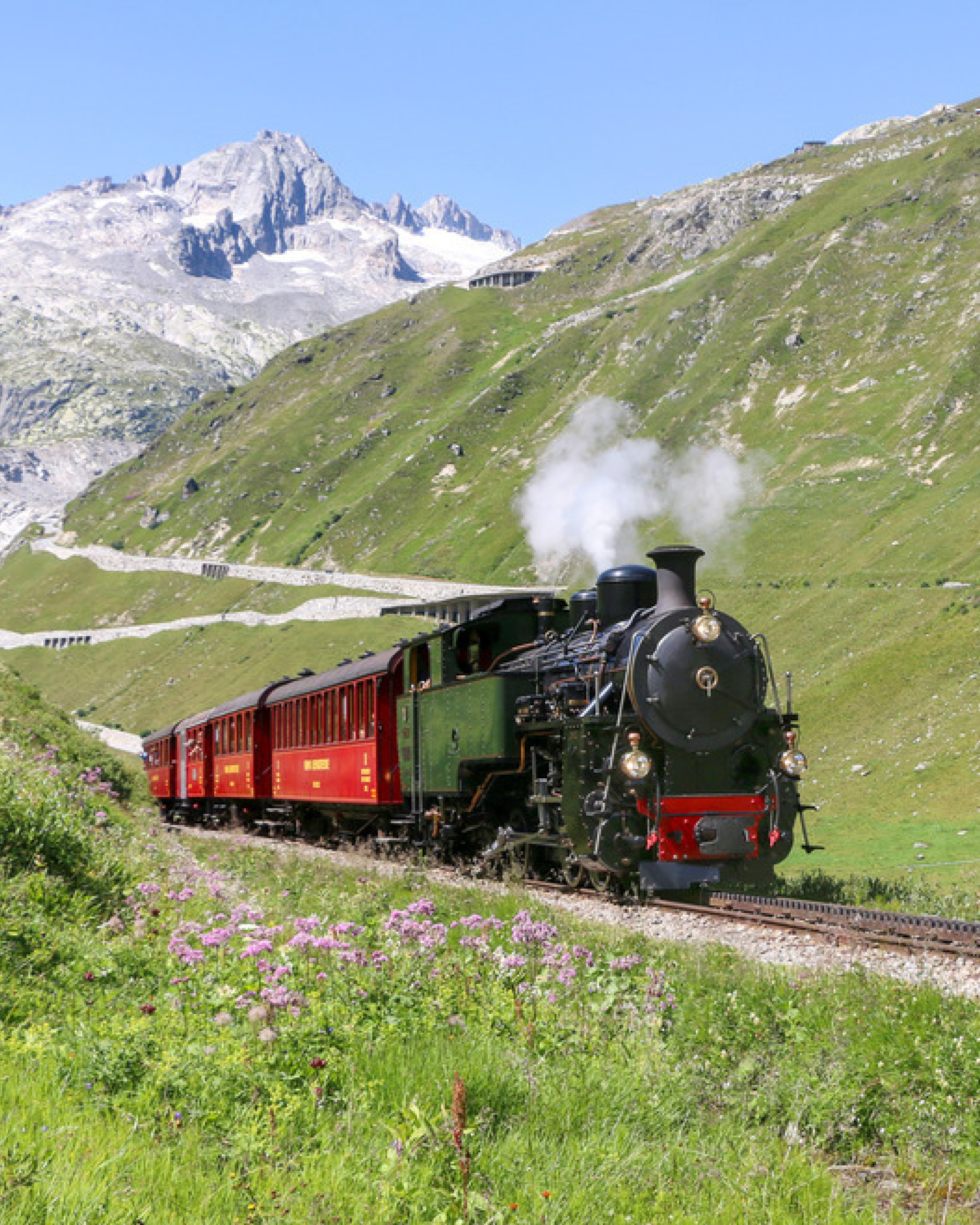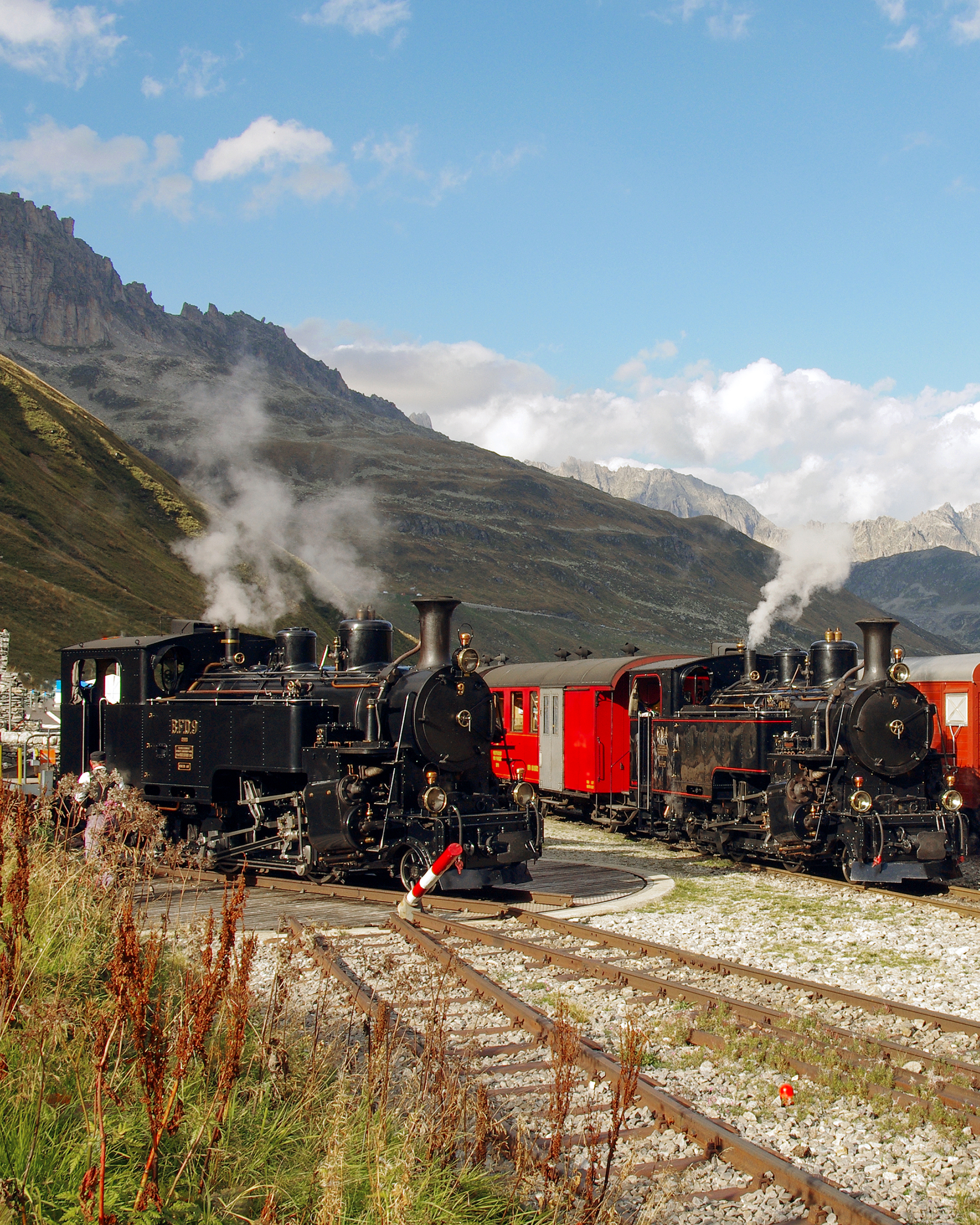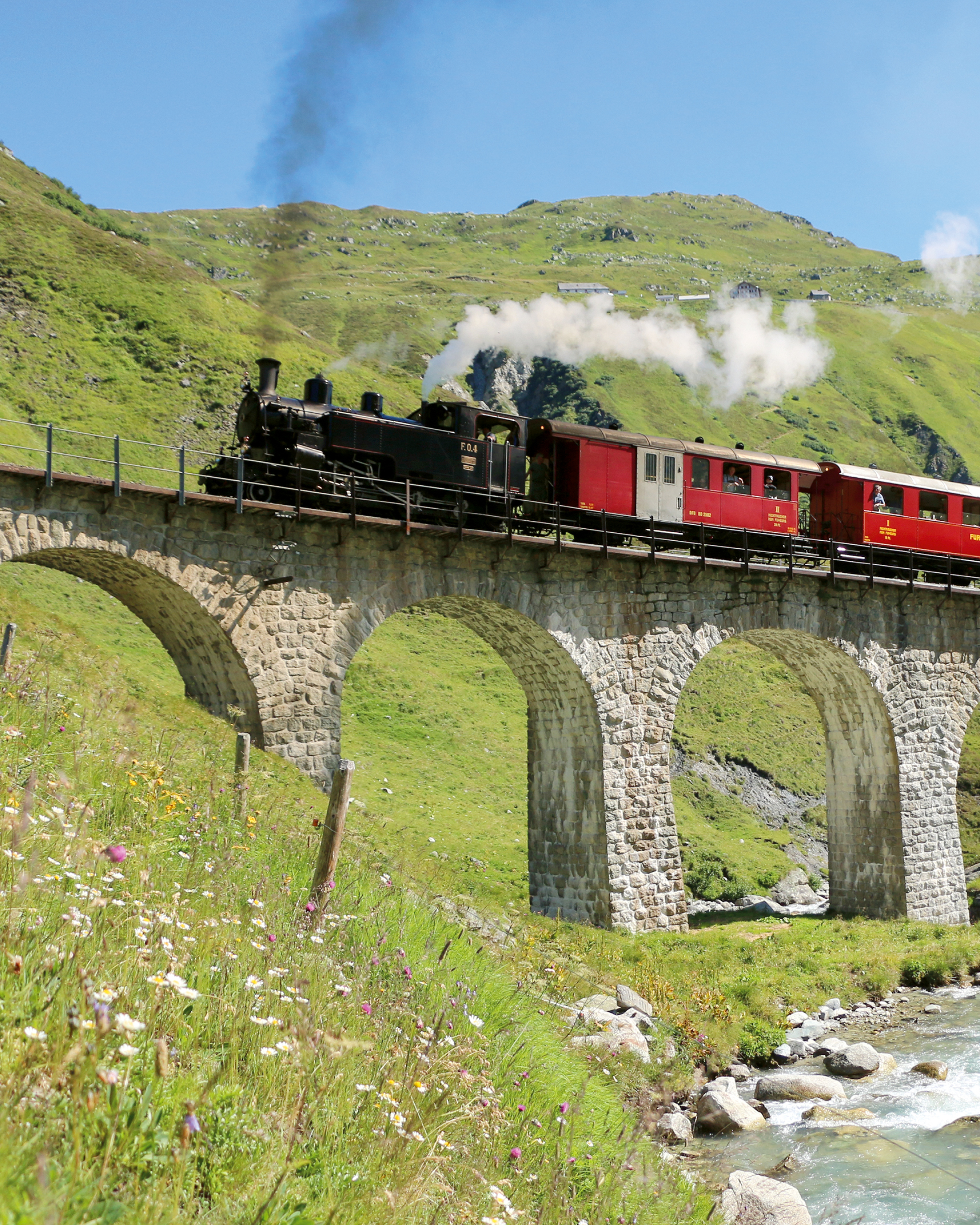 This nostalgic steam railway links Realp in the canton of Uri with Oberwald in the canton of Valais in around 2h 40 min.