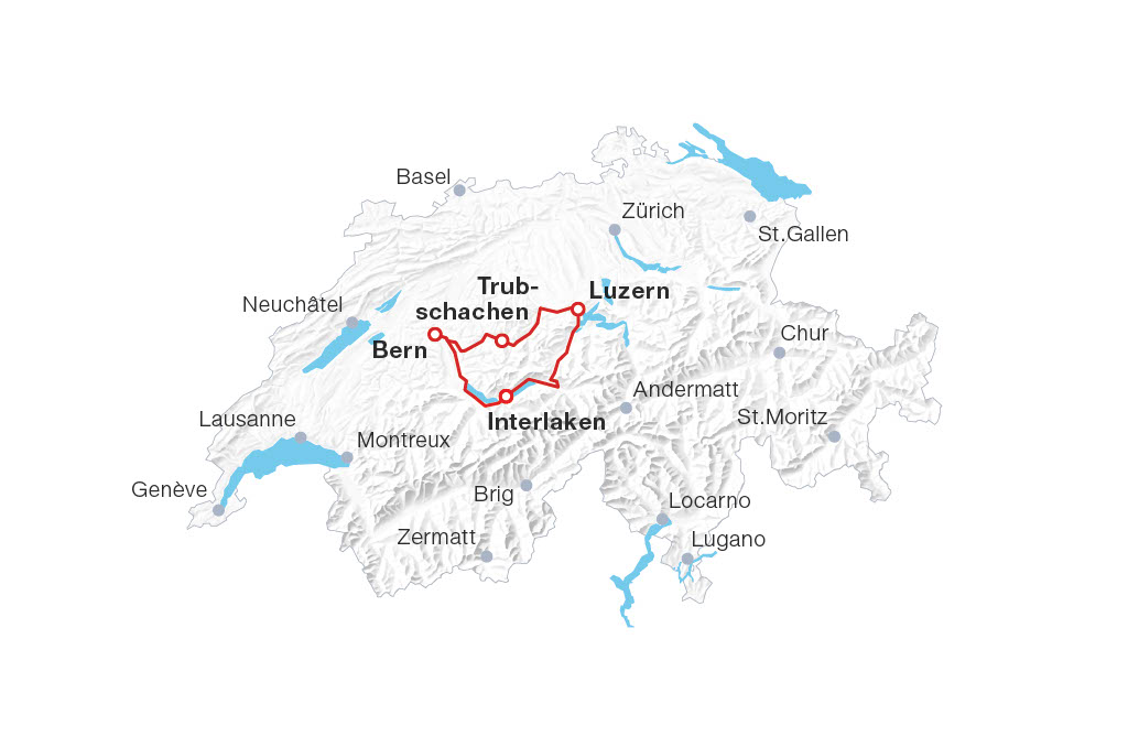 The Kambly Train journey can be extended into a round trip from Luzern aboard the Luzern–Interlaken Express to Interlaken Ost and back to Bern via Thun. From April to October, a boat cruise on Lake Brienz (Brienz–Interlaken Ost) can be included. The trip is flexible in both directions. Duration: 5h.